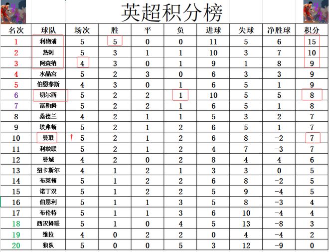 积分榜方面,利物浦还是和西甲的皇马一个赢球的节奏,两队都是联赛5战全胜,欧冠首轮也是稳稳赢球,热刺今天无力赢球,被利物浦将差距拉大到5分,热刺先赛暂时1分优势超过阿森纳升至第2,阿森纳位列第3。切尔西赛季首败后无力超过热刺,2人之差排在第6,赢球的曼联往前追赶,升至第10。