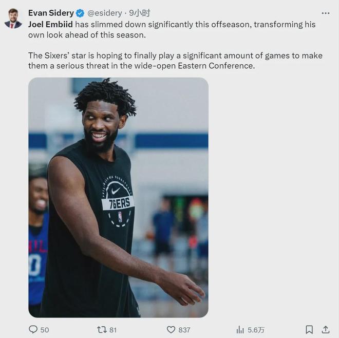 今年男篮欧锦赛开始之前,东契奇已经成功减重,效果非常明显,帅了很多,而恩比德似乎是减重更多。 Sidery表示,恩比德已成功减重了几十斤,而且对于新赛季的征程信心满满。“我希望能在下赛季出战更多的比赛,让76人在东部分区成为争冠大热门球队。”恩比德如此表态。