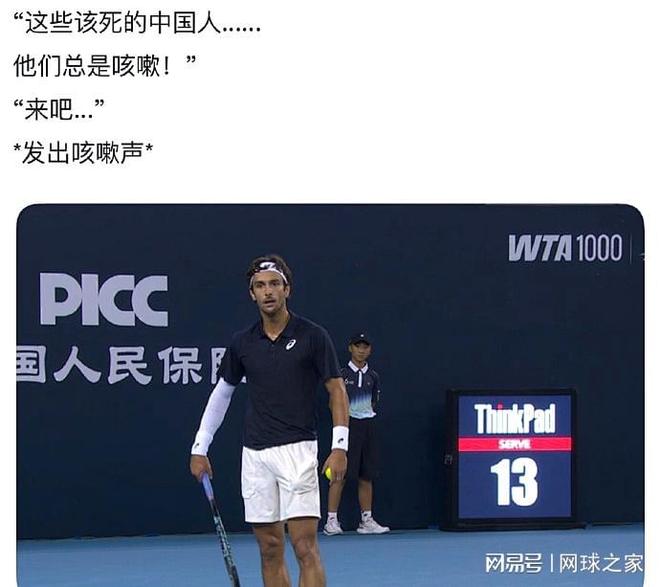 而在穆塞蒂与佩里卡德这场比赛的后半段,意大利人曾因现场有观众不断地咳嗽产生不满,一度用咳嗽回应,并疑似辱骂中国观众,“这些该死的中国人,他们一直发出咳嗽声,来吧,咳嗽吧”。有球迷澄清,当时现场用咳嗽干扰穆塞蒂的不是中国人,而是支持佩里卡德的法国球迷。无论如何,穆塞蒂辱骂中国人,都是我们不能接受的,他也将从此失去中国人的尊重。