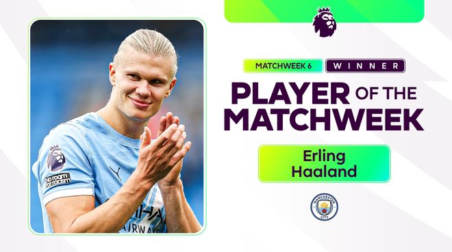 曼城前锋哈兰德被评为联赛第6轮最佳球员。