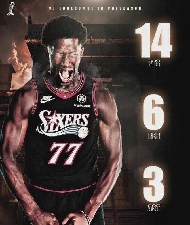 25届探花秀VJ-埃奇库姆(费城)在此役,迎来了自己NBA季前赛首秀,以首发分卫身份出战,亮相时间为全场最高的约31分钟,投篮13中4,其中6中1,罚球5中5贡献14分6板3助,正负值+1,身体天赋的确疯狂,可投篮还是有很大的提升空间。 这哥们在今年NBA夏联,场均能够砍下21.5分8板4助1.5断1.5帽,三项命中率41.5%、15.4%和77.8%,身高1米96&臂展2米02,让他在后场位置的攻防两端都有着很强的侵略性,可日后若想进化成全明星级别球员,必须练出稳定又得有爆发力的投篮水平。