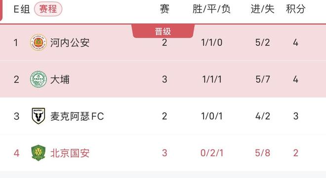 目前3轮结束后,国安3战2平1负,仅积2分排名小组垫底位置。
