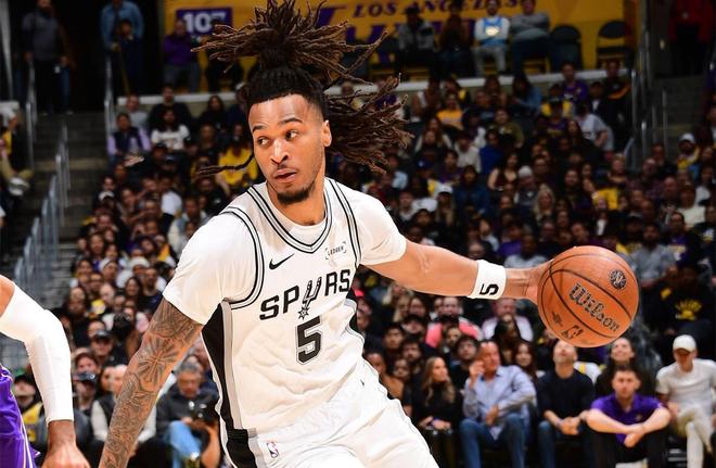 卡斯尔在这场比赛打得游刃有余,内突外投频繁得分,无视湖人球员的防守。这位2024年的4号秀在上赛季夺得了最佳新秀,本赛季则取得了更大的进步。卡斯尔的进攻、防守和组织能力都有了很大的提升。这场比赛之前,卡斯尔场均得到17.4分5.8篮板7.4助攻1.6抢断,四项数据都创造了新高。这场比赛,卡斯尔和福克斯搭档后场,出任得分后卫,他的表现完胜里夫斯,后者打了40分钟,16投6中,得到15分8篮板7助攻,出现3次失误、5次犯规。卡斯尔首节为马刺率先得分,他制造詹姆斯犯规两罚全中,然后助攻福克斯投进三分球。这一节他两次上篮得分,其中一次打成2+1。卡斯尔首节贡献7分。第二节比赛,卡斯尔两次助攻尚帕尼投进三分球,还靠罚球得到2分。