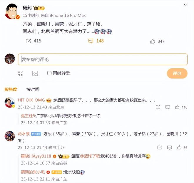 在12月13日一场CBA常规赛中,北京和江苏之间进行了潜力赛,结果不出意料,这次篮协又遭到了几乎所有人的抨击。北京首钢在与江苏的潜力赛中,竟然排出了方硕(35岁)、雷蒙(30岁)、张才仁(30岁)、范子铭(27岁)、翟晓川(32岁),平均年龄30.8岁的阵容,更重要的是,这套阵容竟然还输给了江苏!